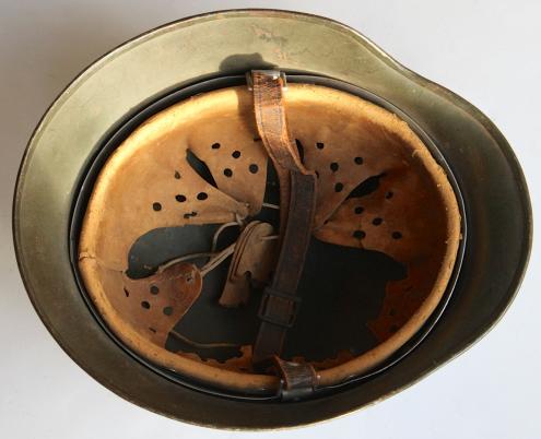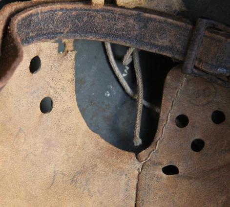 Leather liner a bit dry with some damaged tongue ends. Interesting use of a captured Brodie helmet chin strap. These of course still being in use in WW2 by armoured crews and 2nd line soldiers.