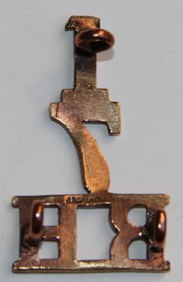 WW1 shoulder title with the legs of the " T " officially clipped to form " 1 " for a soldier who has moved from a Territorial Btn. to the 1st Btn.