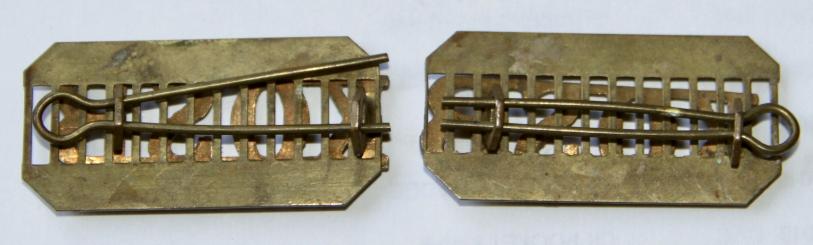Nice matched pair of shoulder titles. Hex lugs. Brass back plates. Age toned. Uncleaned. V.G.C.