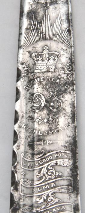 Acid etched blade with " 93rd Sutherland Highlanders " and Battle Honours, "Cape of Good Hope, Alma,Balaklava, Sevastopol, Lucknow."