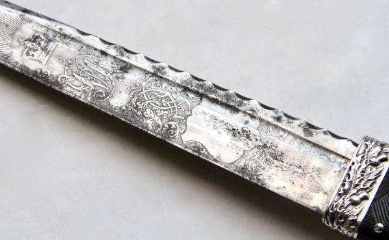 Clipped back blade with good point, some areas of darkening . Acid etching nice and clear.