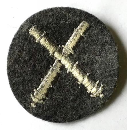 A Hermann Göring Regiment Flak Artillery Armorer’s Trade Badge, constructed of a Luftwaffe blue-grey wool base, with machine-embroidered, diagonally angled and crossed antique cannon barrels, in silver-grey threads, measuring 49 mm in diameter.