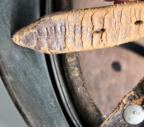 Good early sheepskin liner with size 56 stamp. Original draw string. Double banded aluminium liner band.