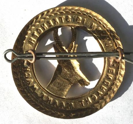 WW1 Gilded example with correct motto for the Great War Left facing Springbok. Motto in English and Afrikaans. One lug slightly bent, otherwise, V.G.C.