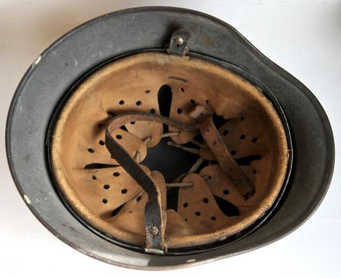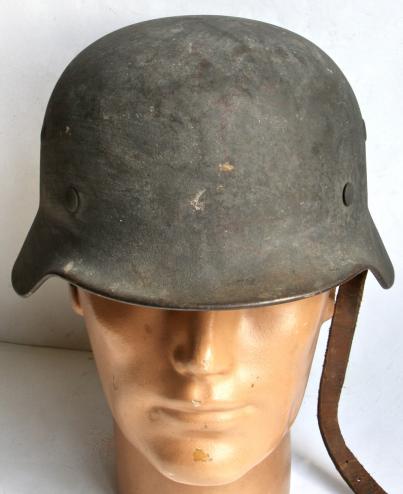 Has the original chin strap albeit long end is in 2 parts with the tip absent and the short end is missing the buckle.
