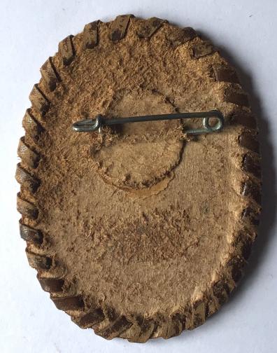 Super 1936 Day Badge. Large oval. Details and eagle and swastika embossed into leather. Stitched trim. Excellent condition.