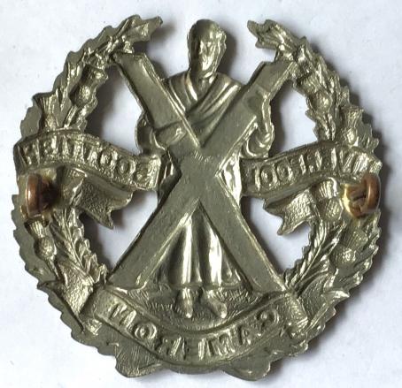 Nice example of a w/m cap badge . Good detail, no rubbing or damage. Longer lugs for use on the feather bonnet. V.G.C. with nice age toning.