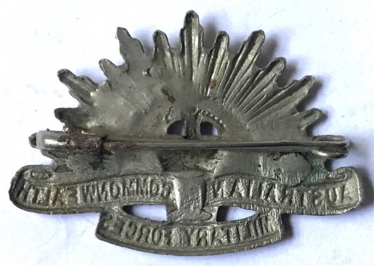 Unmarked silver or heavy plate. Collar dog size but with pin back. Well detailed. Kings Crown so could be either world war. Condition is, VGC
