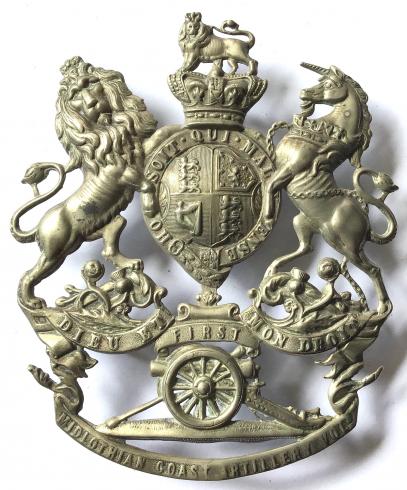 Royal Arms with short scroll below reading, "First" over the gun. Below a long scroll with, 'Midlothian Coast Artillery Vols'.