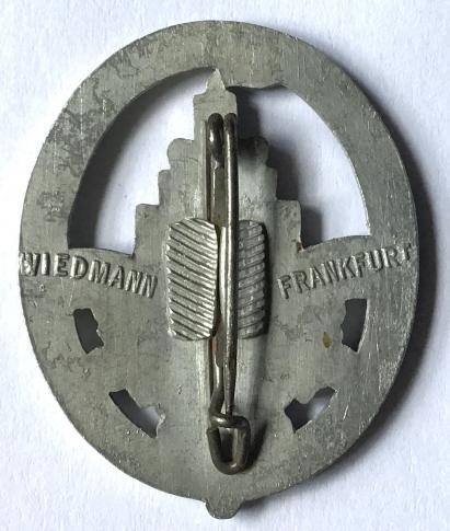 Nice maker mkd. alloy day badge. Wiedmann Frankfurt maker mkd. to bsck. Great detail. V.G.C.