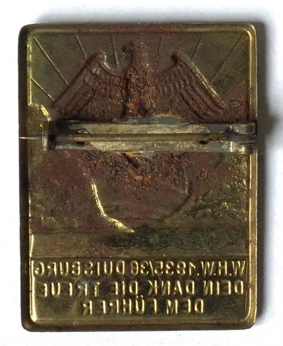 Rare, not listed in Reinhard Tieste tinny book. Nice die struck brass badge. Very well detailed. Text translates roughly as "Your thanks, the loyalty to the Fuhrer" 1935. V.G.C.