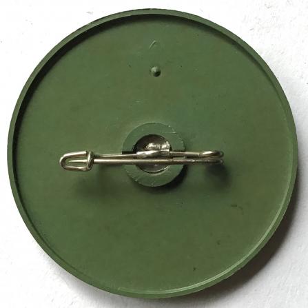 scarce early green bakelite day badge. Approximately 4 cm diameter.