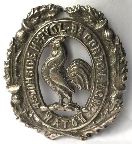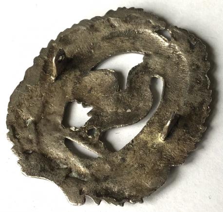 Cast unmarked silver possibly for an officer. Flat brass loops as is fairly common on these badges. Slight polishing to the wing and tail of the Cock of the North. Substantial badge.
