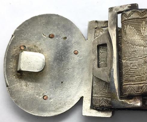 Substantial silver plated oval buckle with gilded Cameron device to centre.