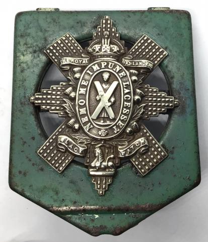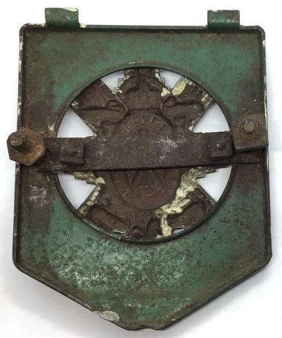 Rare piece. Pre '36 style badge with scrolls mounted on a green painted shield. Mudguard/radiator fixings to back. V.G.C.