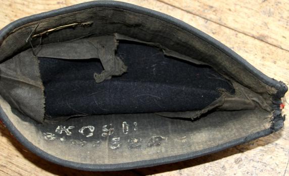 Lining has had the crown part deliberately torn out by the soldier so possibly used in a hot climate ? Painted "KOSB" and number.