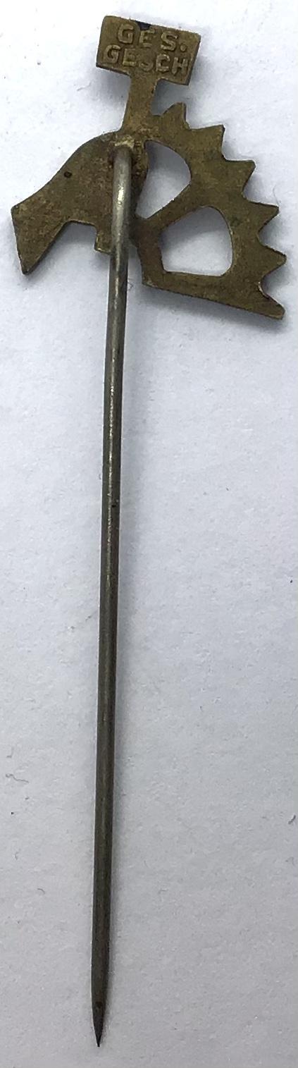 Good detail stick pin. Swastika hammer in a clenched fist and cog wheel with "N.S.B.O.” Straight pin not knurled. V.G.C.