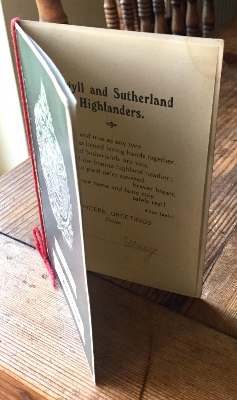 Nice condition vintage fold out greetings card. Shows early Victorian era cap badge. C/w red string. Circa the Great War, possibly earlier. V.G.C.