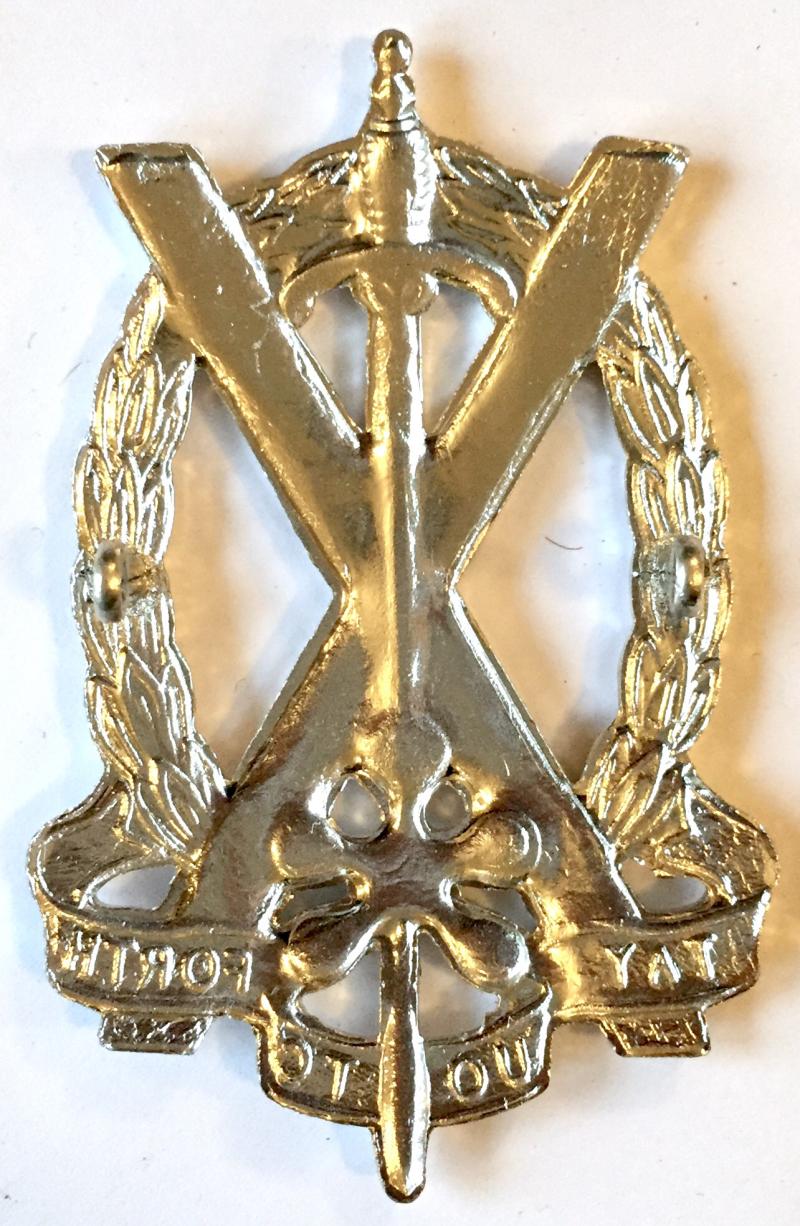 Scarce. Mint condition cap badge. Anodised.Staybright. Comes on a piece of Regimental tartan.