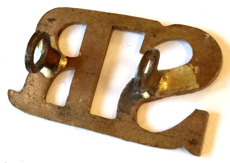Nice large size brass SR title circa WW1. Rare flat brass lugs. These stamped brass lugs with a circular hole are found mainly on Scottish badges. V.G.C.