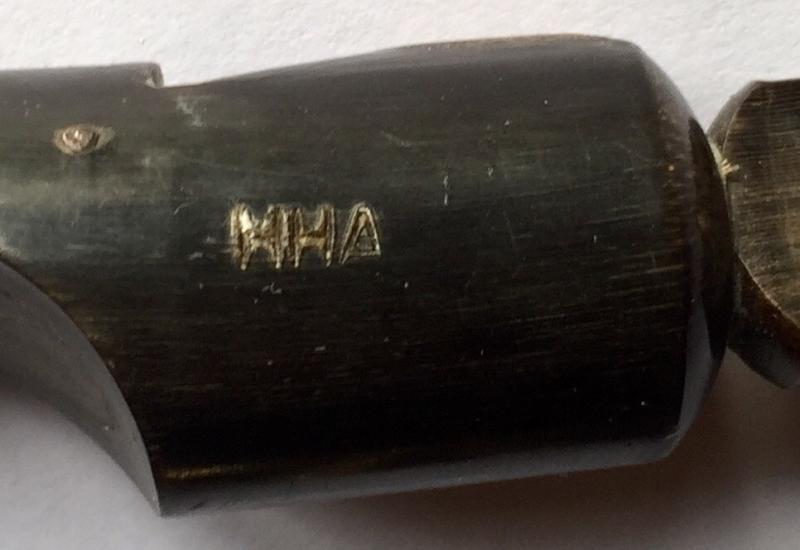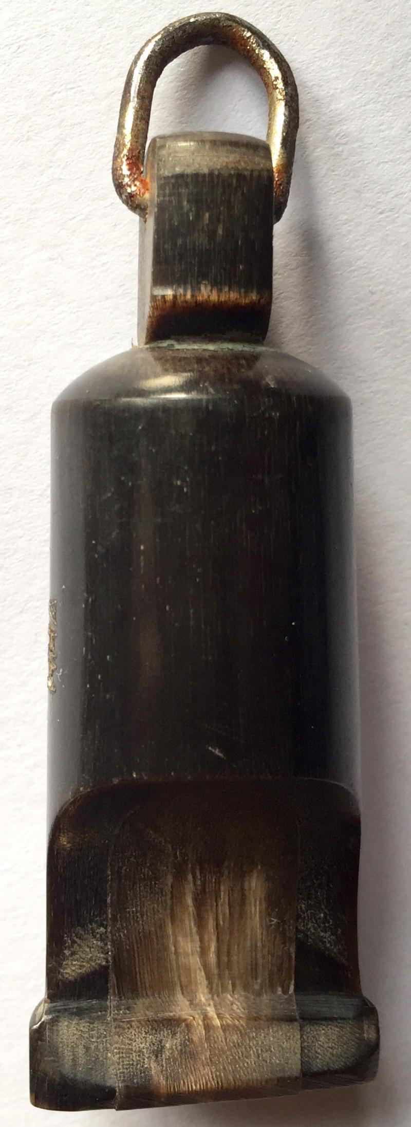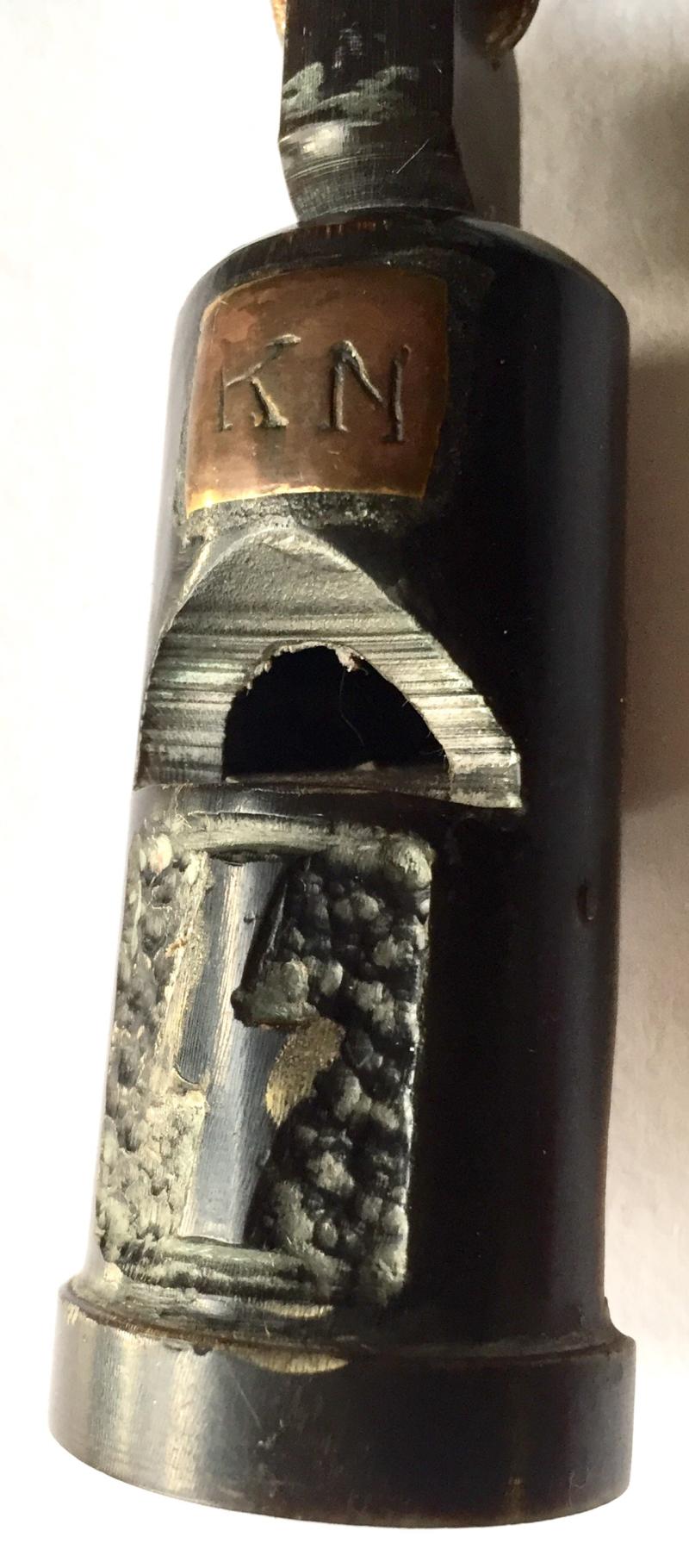 Signal whistle made from horn and not the issue bakelite. Carved DJ device and brass plate with owners initials. Also maker mkd. Metal lanyard ring. Working. Rare piece. V.G.C.