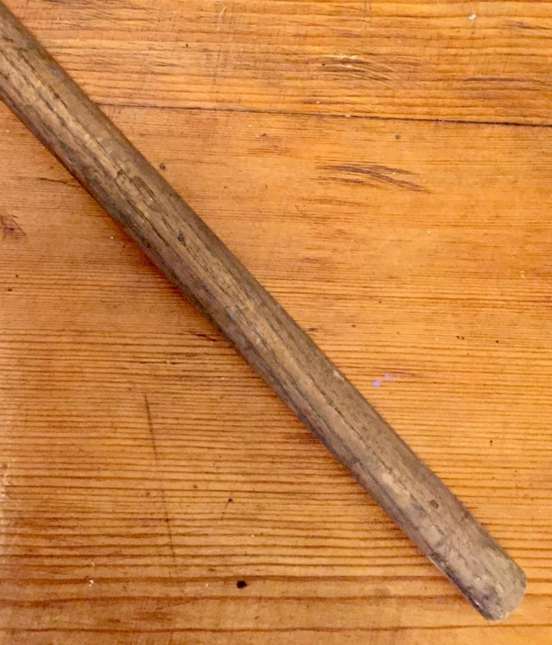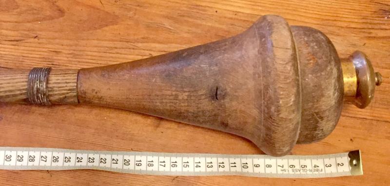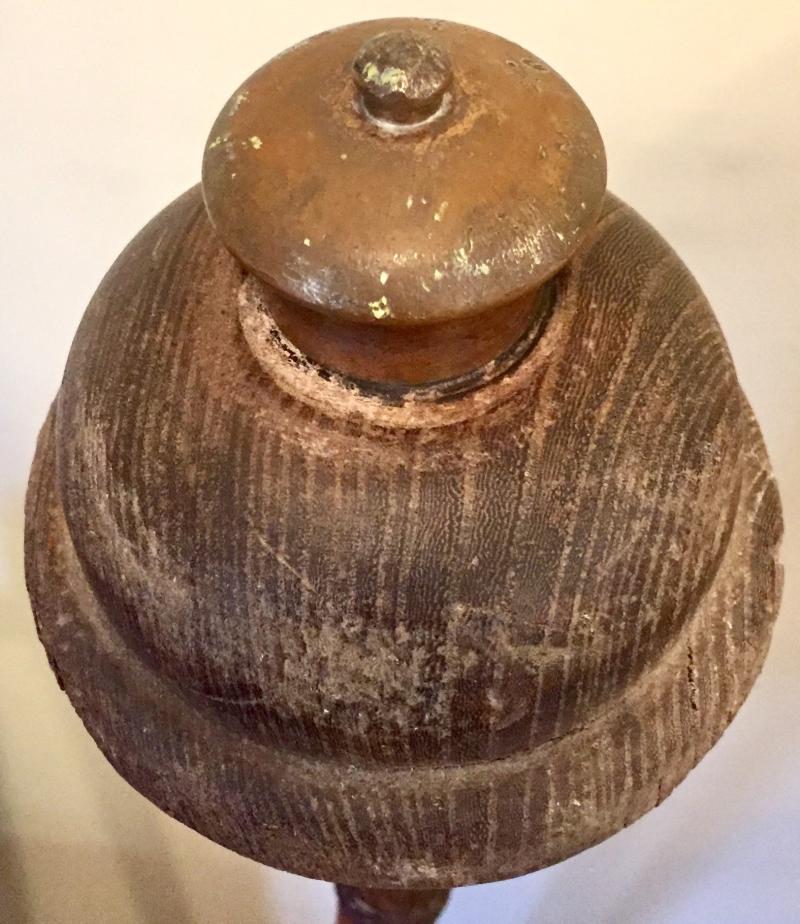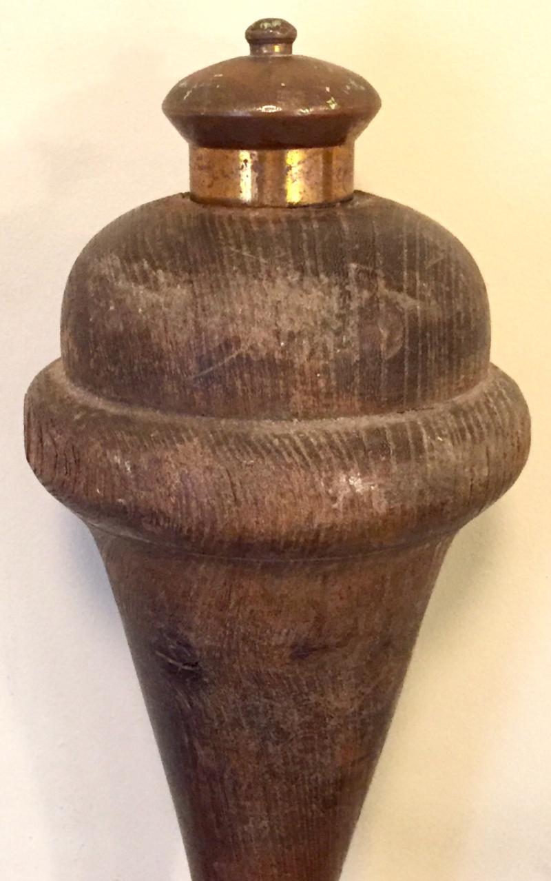 Oak shaft and solid oak shaped and weighted head with gilded copper top finial.
