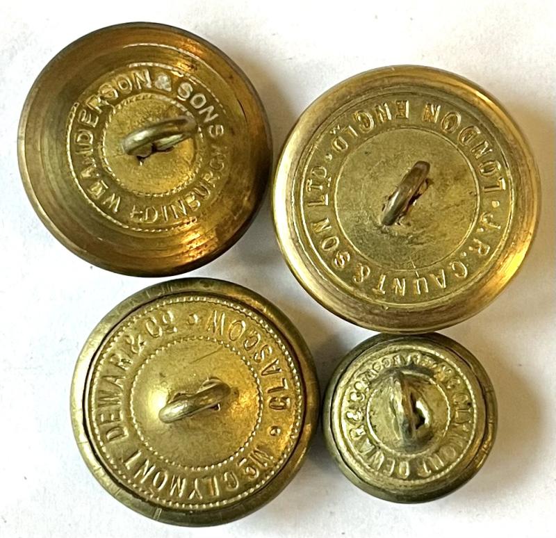 Good selection of these scarce buttons. 3 large tunic front size and one small for pocket and epaulette. 2 by Clymont/ Dewar Glasgow, one Anderson , Edinburgh and one Gaunt. V.G.C.