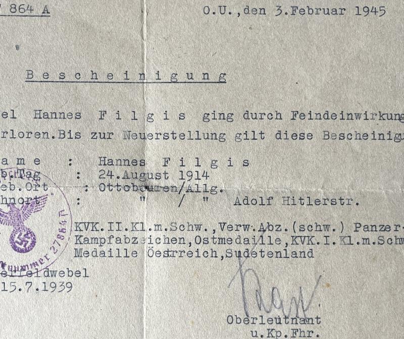 Wehrpass with no entries with accompanying document stating " Sgt Hannes Filgis lost his soldbuch in combat and this document acts as a valid stop gap until his replacement can be issued.
