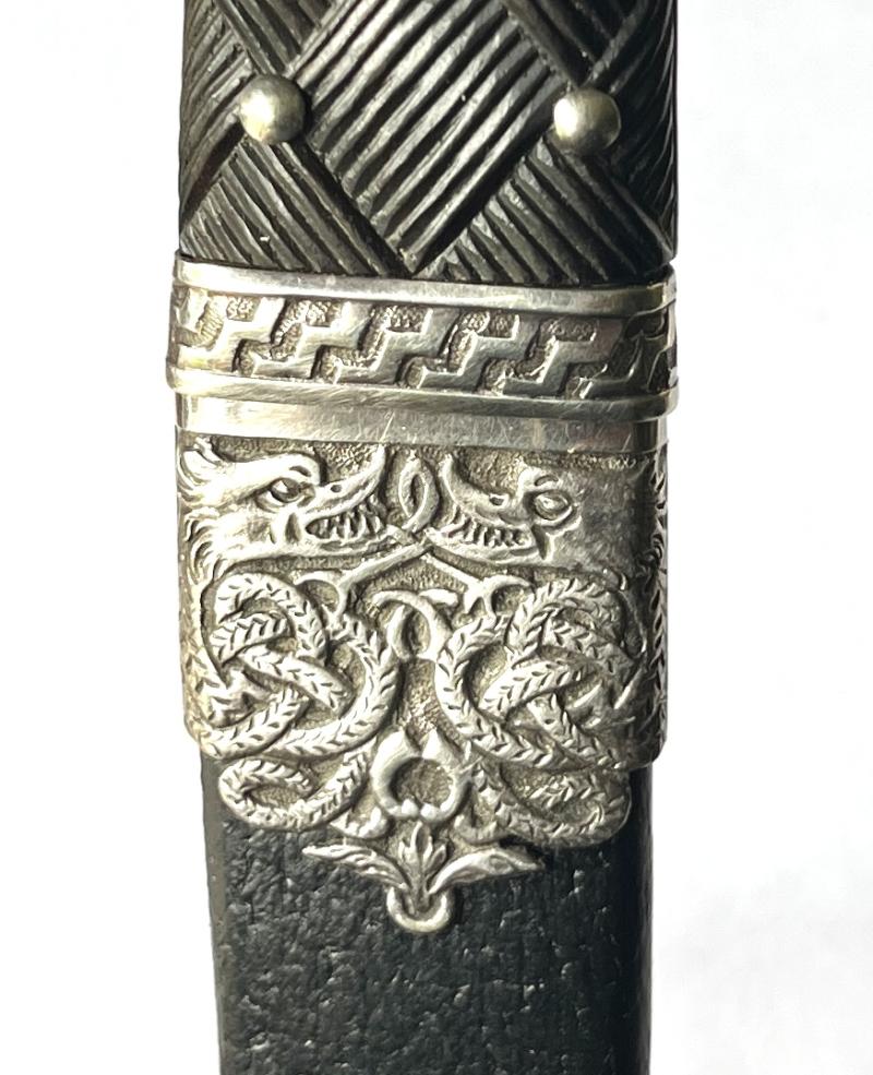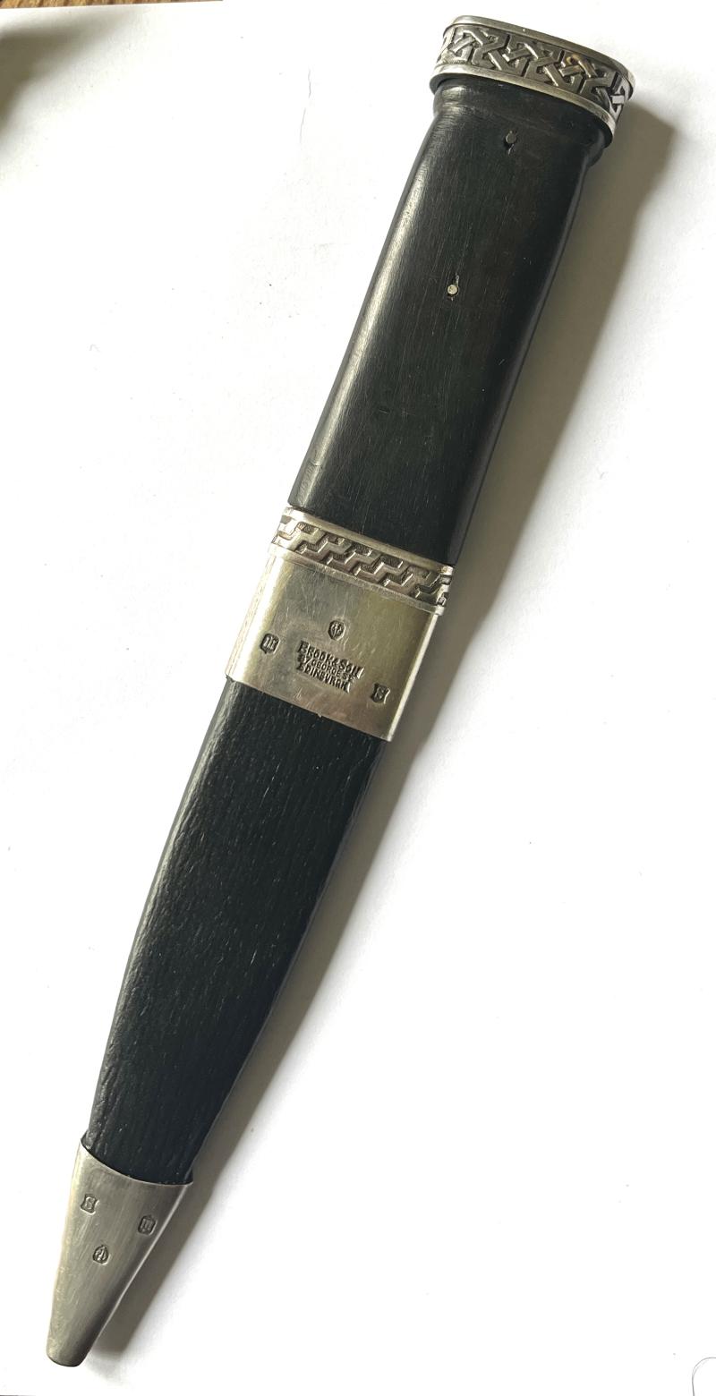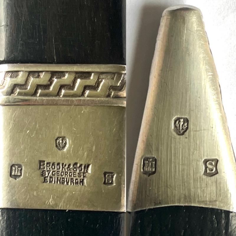 Both scabbard mounts with 1923 Edinburgh silver marks “S”and "Brooke & Son , 67 George St. Edinburgh" retailer details.