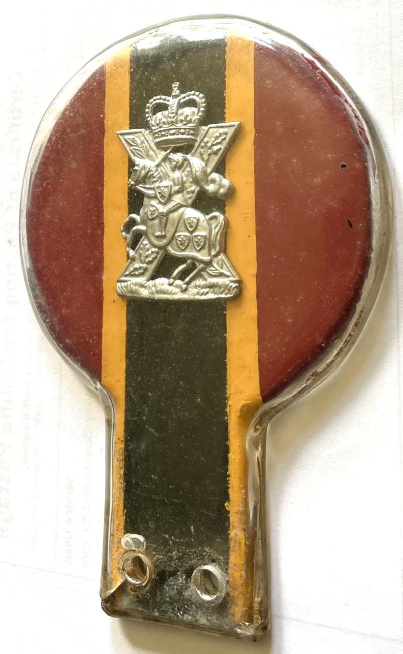 Rare Fife and Forfar Yeomanry car mascot / bumper badge. Post '52 Regimental device over Regimental colours. Heavy acrylic body. Circa early 1960's. V.G.C.