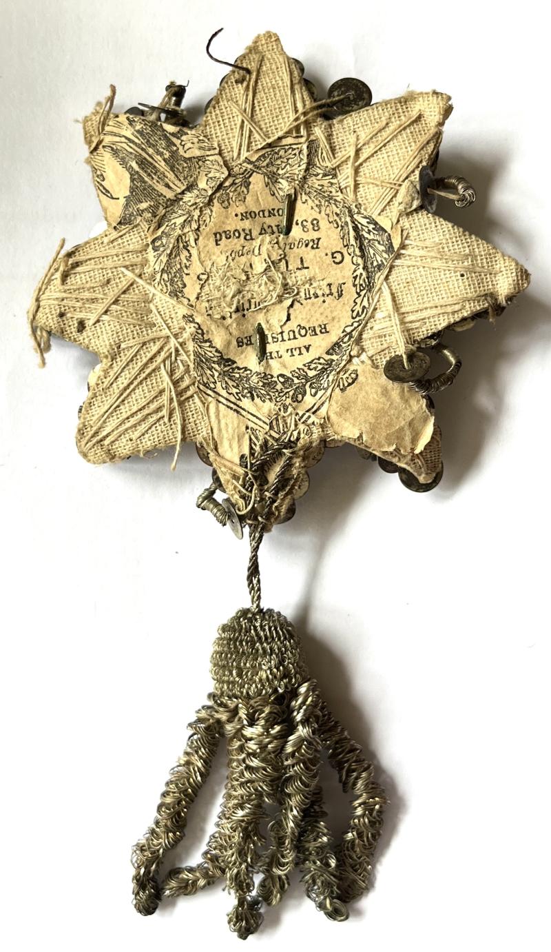 Very ornate piece with 2 gilded Highlanders to the centre. Silver bullion wire. Makers label to rear. Likely a sash badge. V.G.C.
