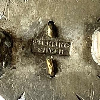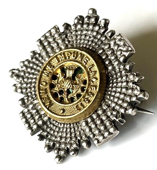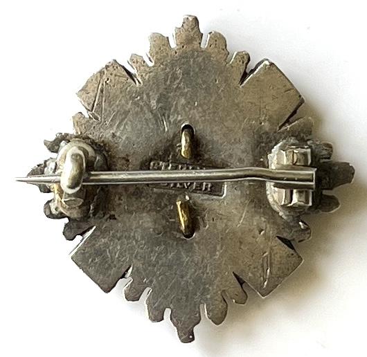 Nice correct small size pin back for wear on the officers forage cap. Bi metal, silver / gilt. Green enamel behind centre. " Sterling " silver stamped. Original pin and hook. V.G.C.
