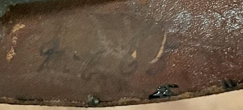 It's marked in the rear peak, either a name or Regiment details, Indistinct.