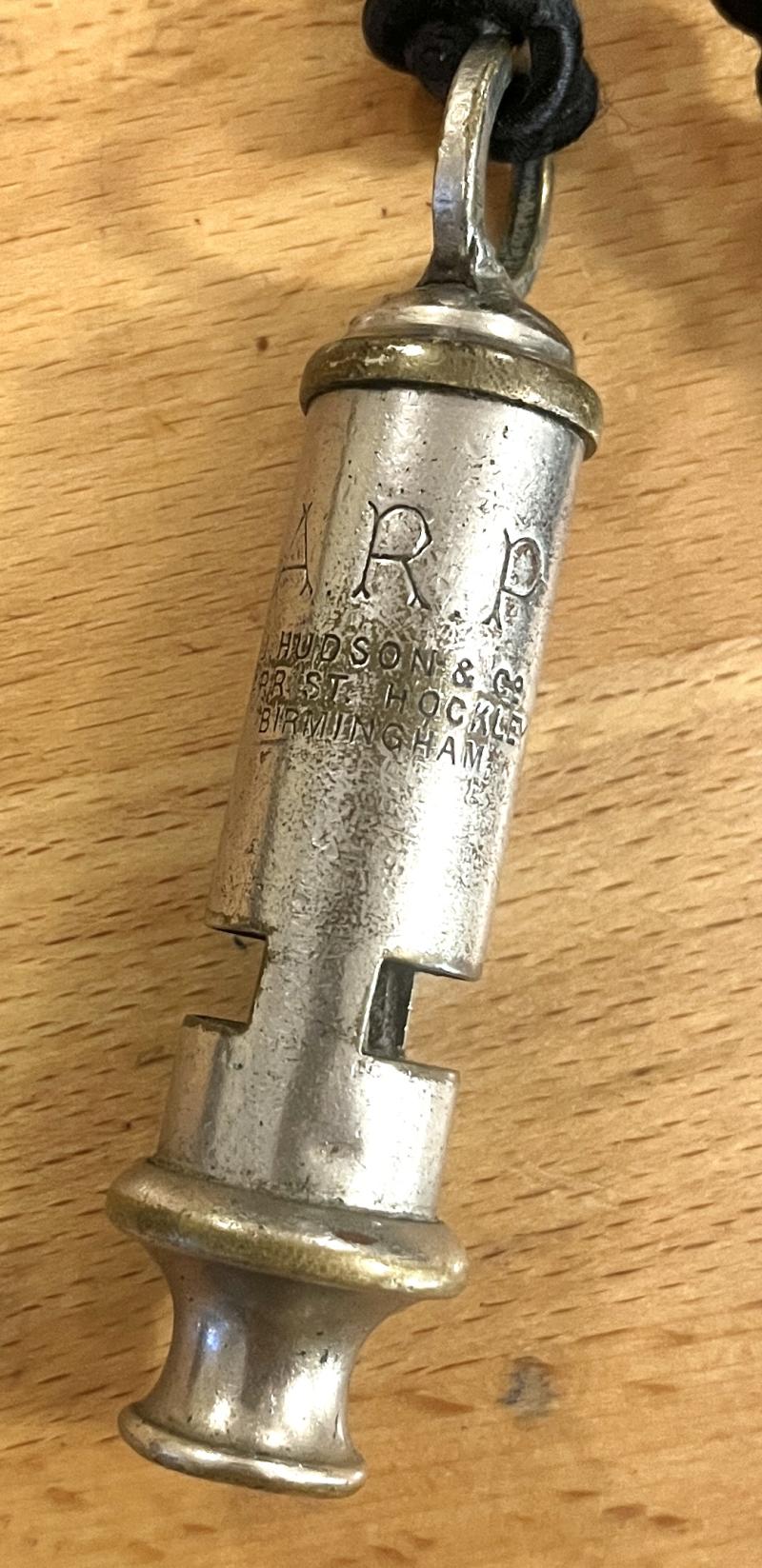 WW2 " A.R.P. " ( Air Raid Precautions ) whistle on black pleated lanyard.