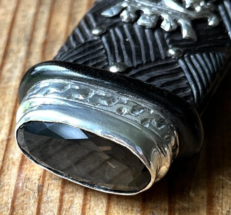 Hand etched silver studded handle with real amber coloured stone to top and Princess Louise cypher to handle.