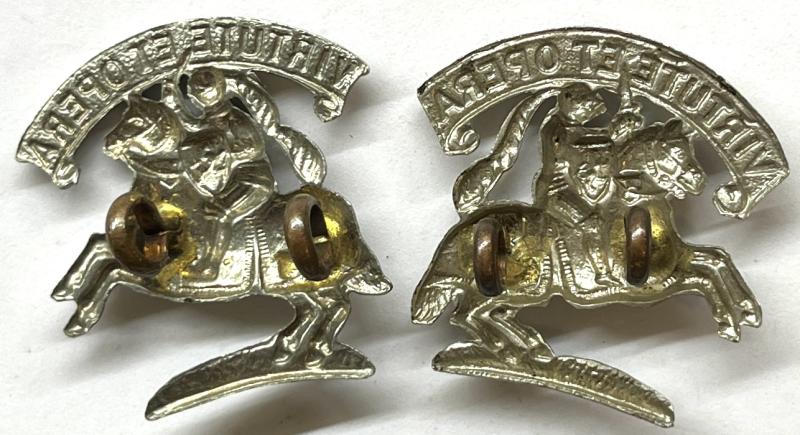 Rare matched facing pair of O/r's collar badges. W/m. Well detailed , no rubbing or damage. Thane of Fife with scroll above “Virtute Et Opera". V.G.C.