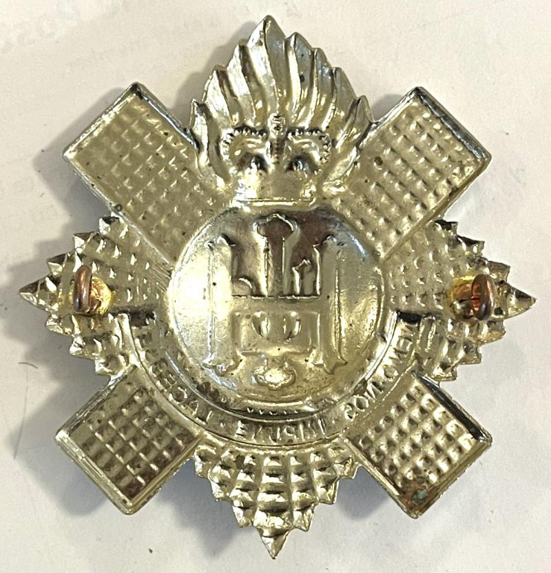 Scarce badge as worn by the Royal Highland Fusiliers only. RHF formed from the HLI and RSF. Large . Chromed white metal. Good detail. V.G.C.
