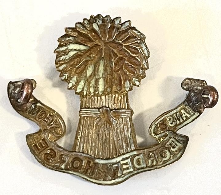 Nice One Looker original example. With lugs. Old polish residue to back. Toned brass. Scroll with " Lothian and Borders Horse Yeomanry " V.G.C.