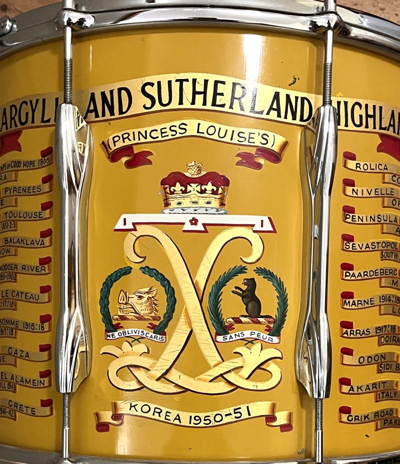 Argyll & Sutherland Hldrs 1st ( Regular ) Btn. Pipe Band tenor drum with hand painted battle honours by Potters of Aldershot.