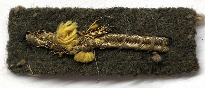 Re introduced in WW2 as a strip of Russia bullion wire braid on khaki cloth as opposed to brass stripes for the Great War.