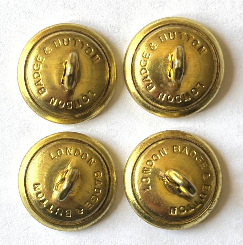 Officers flat Regimental buttons for possibly Mess Dress or Blazer. Gilded brass. 16 mm diameter. Marked London Badge & Button to rear. 4 matching with nice detail. V.G.C.