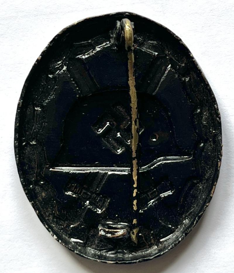 Great example. Black painted die struck brass. Some paint loss to the high points of the Swaz and a little from the wreath otherwise the shiny paint is good. Brass needle pin to back. V.G.C.