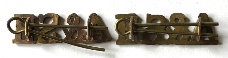 Good matching set of brass shoulder titles with the early hex lugs. WW1 . Brass. Nice toning. Did'nt sit out the war this pair ! V.G.C.