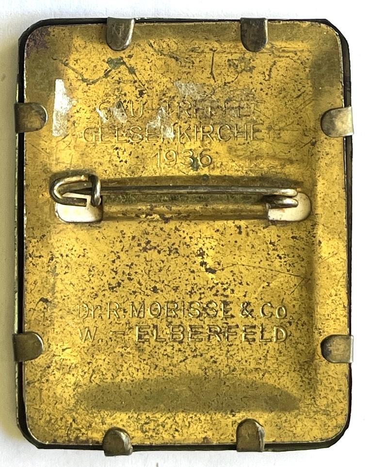 Maker mkd. ,"Dr. R. Morisse & Co. W. - Elberfeld," and "Gautreffen Gelsenkirchen 1936", to the back. Scarce badge.