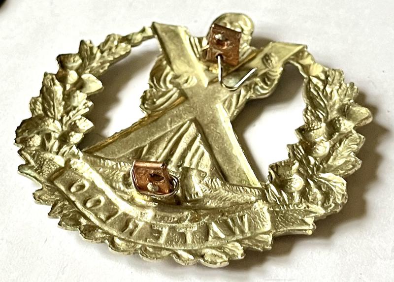 Scarce waist belt centre . Same as the Cameron cap badge but with " Waterloo " battle honour. North and south fixings . W/m . V.G.C.