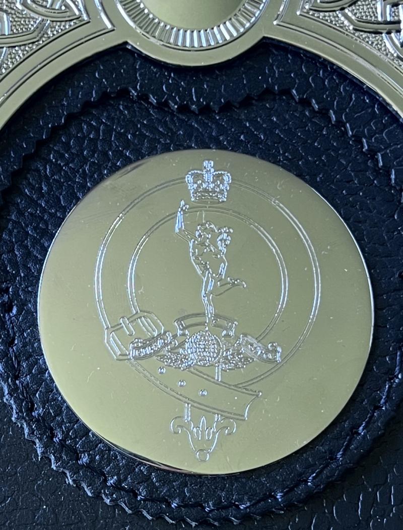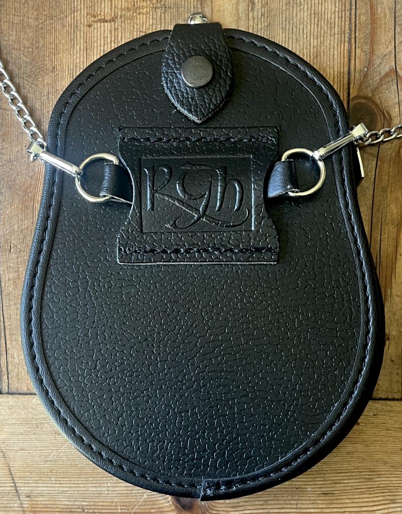 Leather day sporran unique to Royal signals Pipes & Drums .Pebbled stout black leather with heavy chrome Celtic pattern cantle with finial.