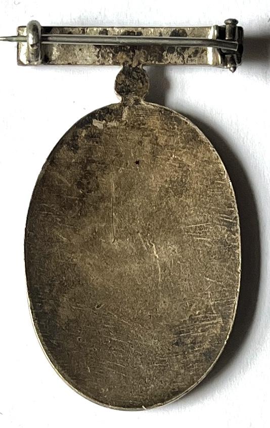 Silver plated oval shape surmounted by a pin bar, the centre with an undamaged translucent enamel red cross.