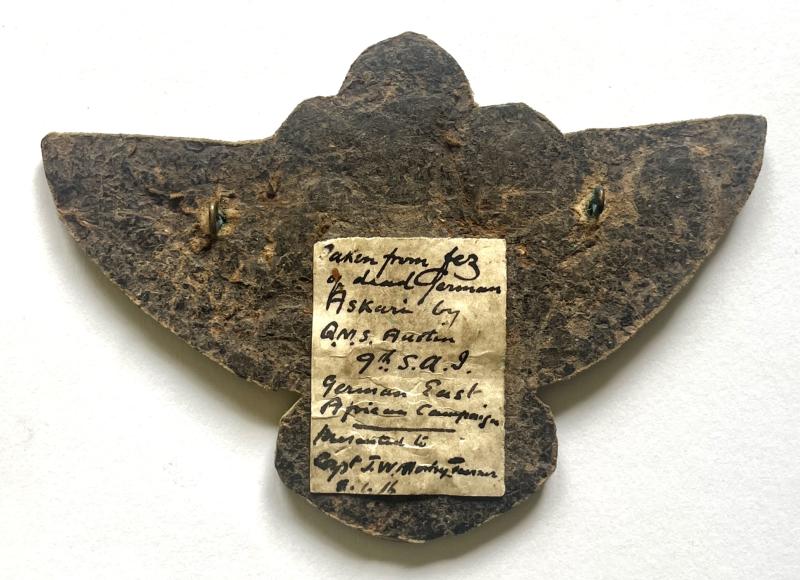 What is especially interesting is the original hand written note attached to the back by a soldier of the 9th South African Infantry ( named ) who took this as a trophy which was later presented to an officer ( named ).