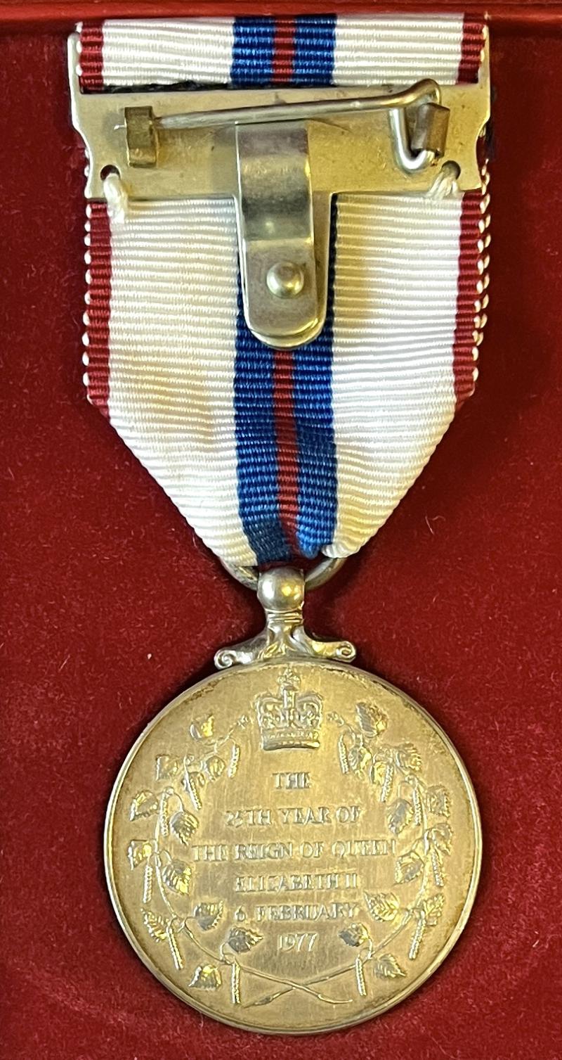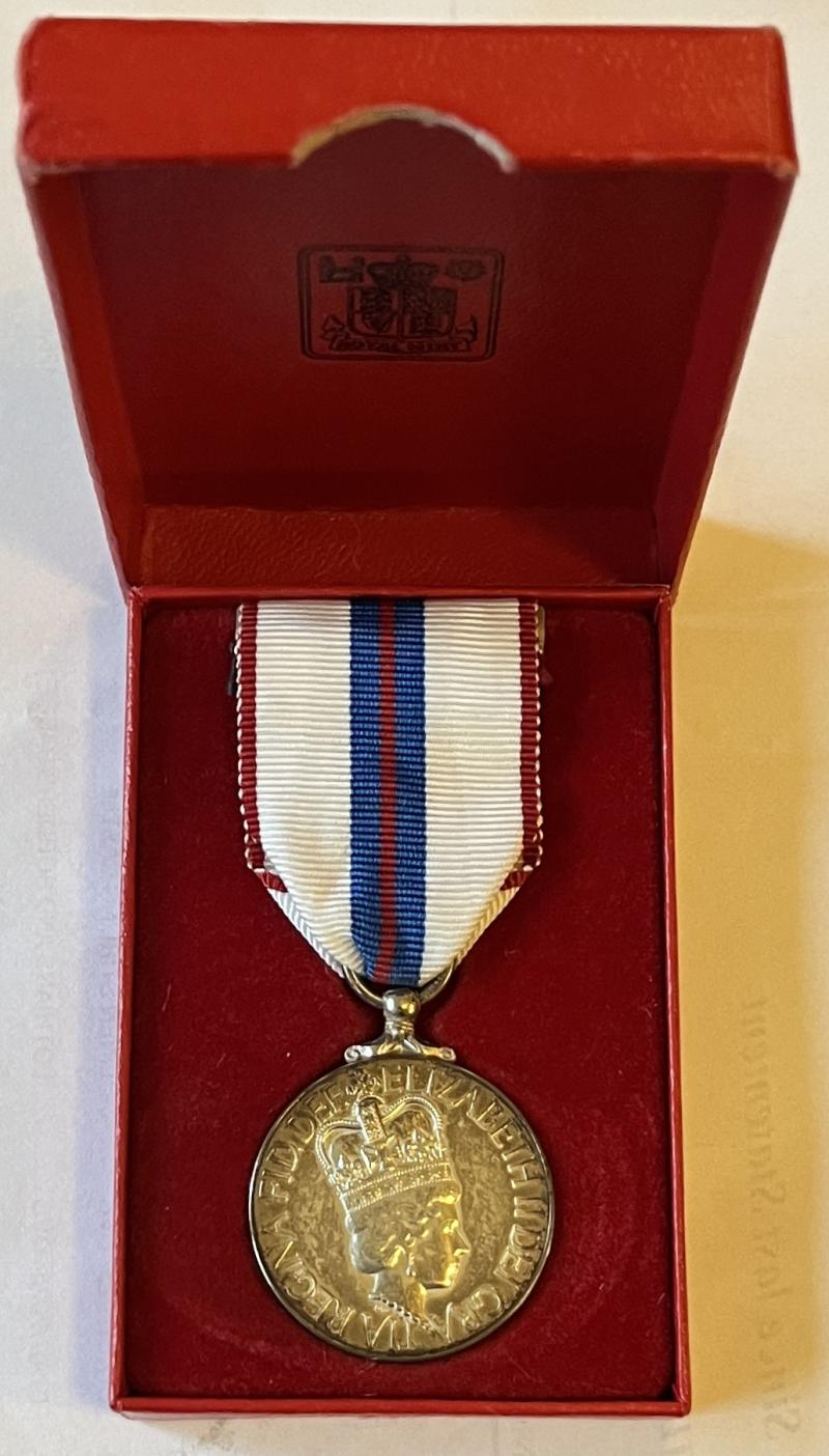 Nice untouched original . Age toned but will come up nicely with a silver cloth if desired. Original ribbon with pin for wear. Good condition Royal Mint box of issue. V.G.C.