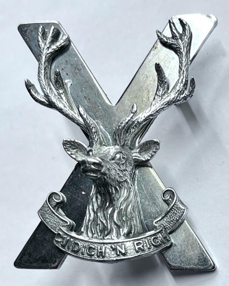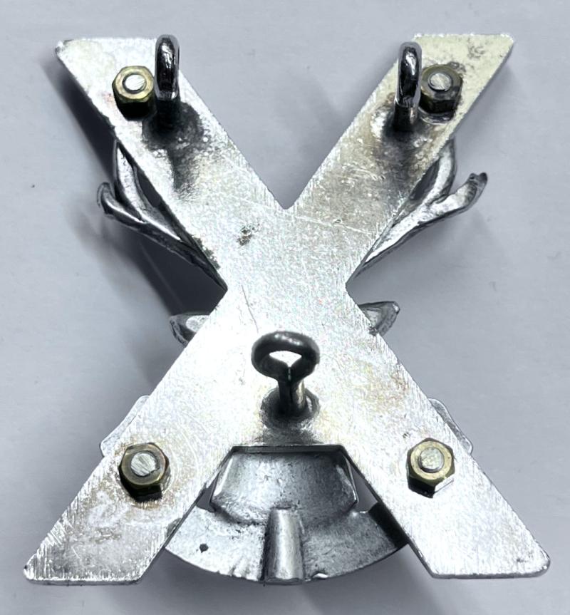 Good 2 piece quality example . The raised stag can be unbolted for cleaning. 3 lugs. Frosted silver stag on plated St. Andrews cross as per officers version. V.G.C.